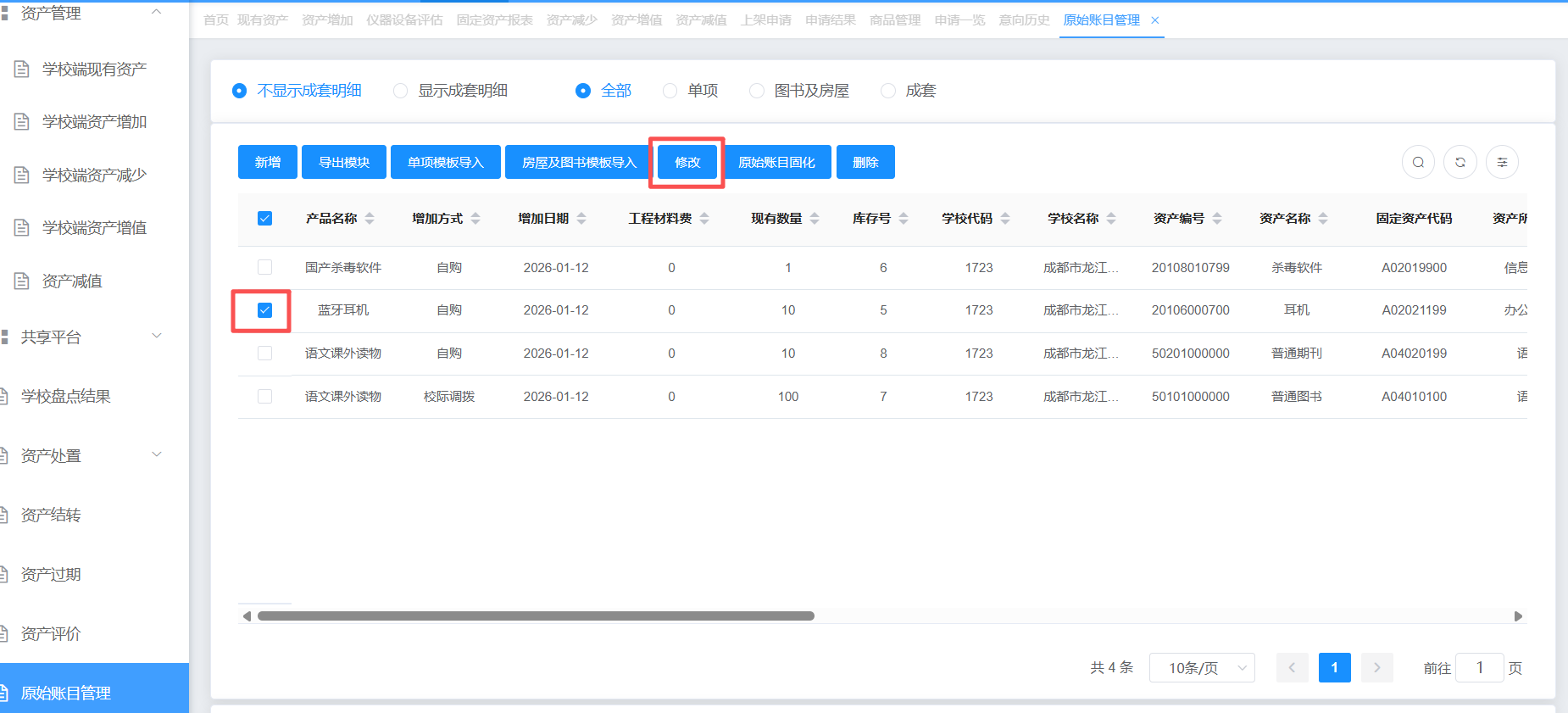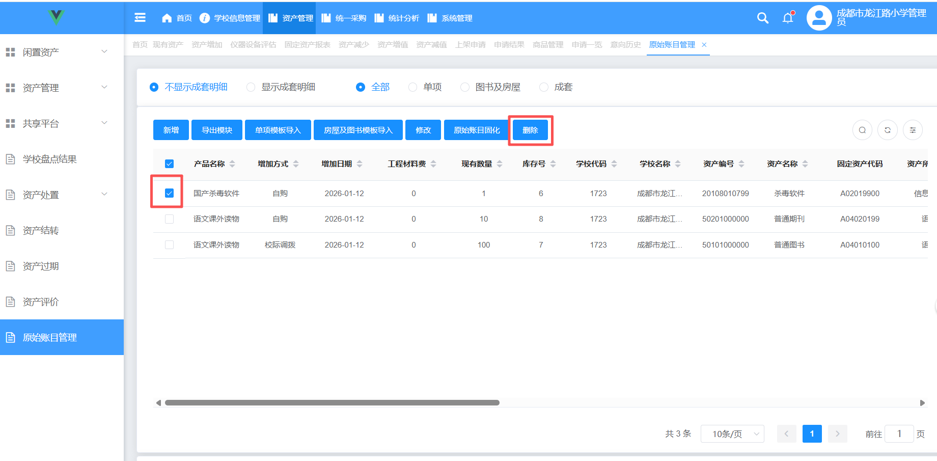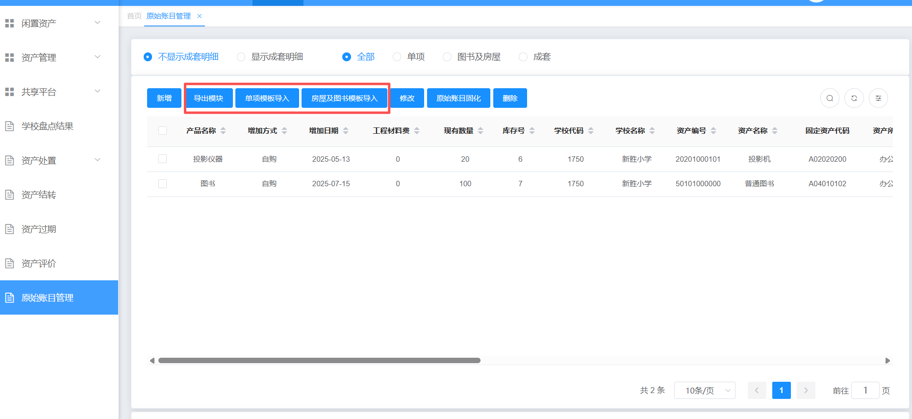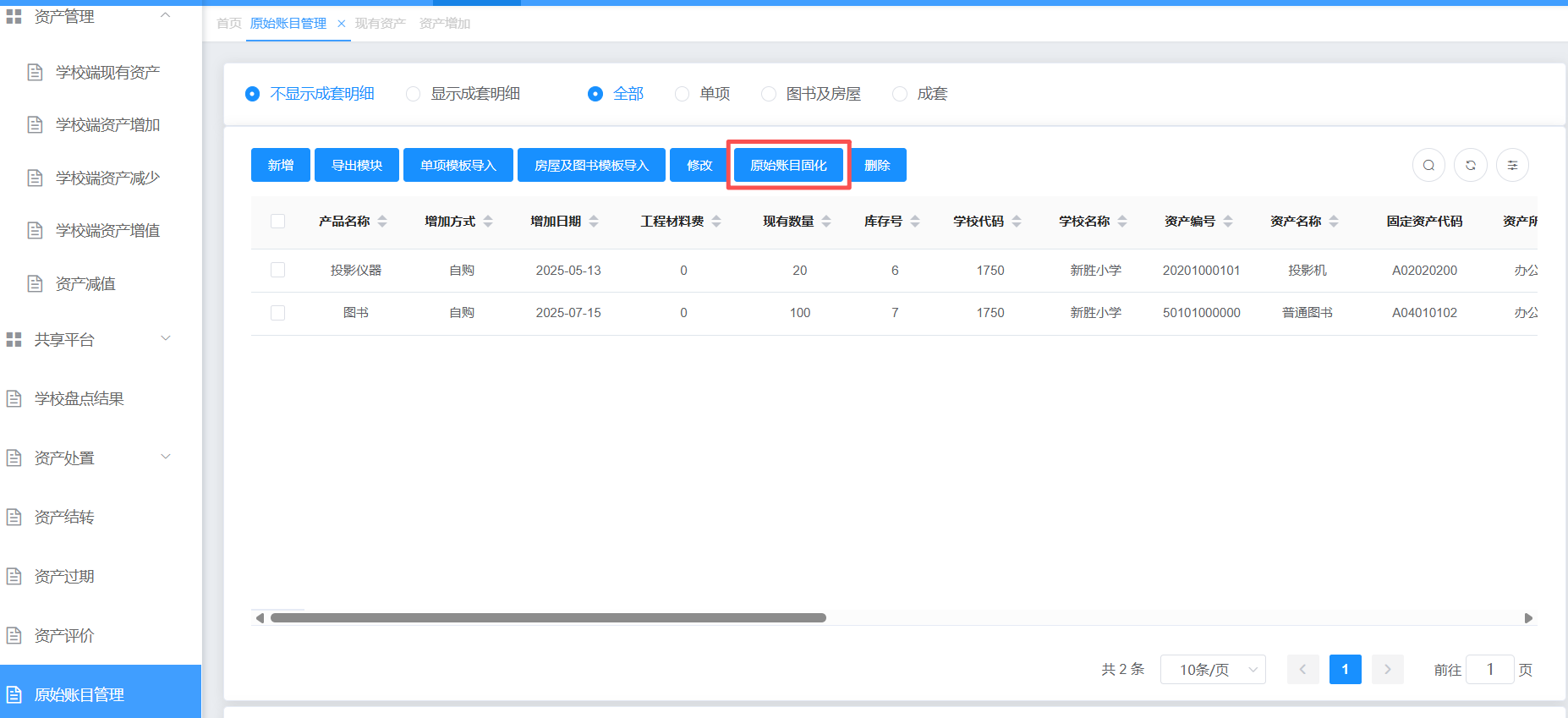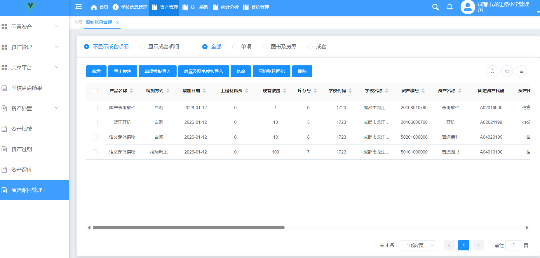 原始账目是指学校未使用此系统前就拥有的所有资产信息。原始账目管理包含对这些原始的资产信息的批量导入、导出,单条新增、修改、删除,对整体原始资产信息的固化处理。