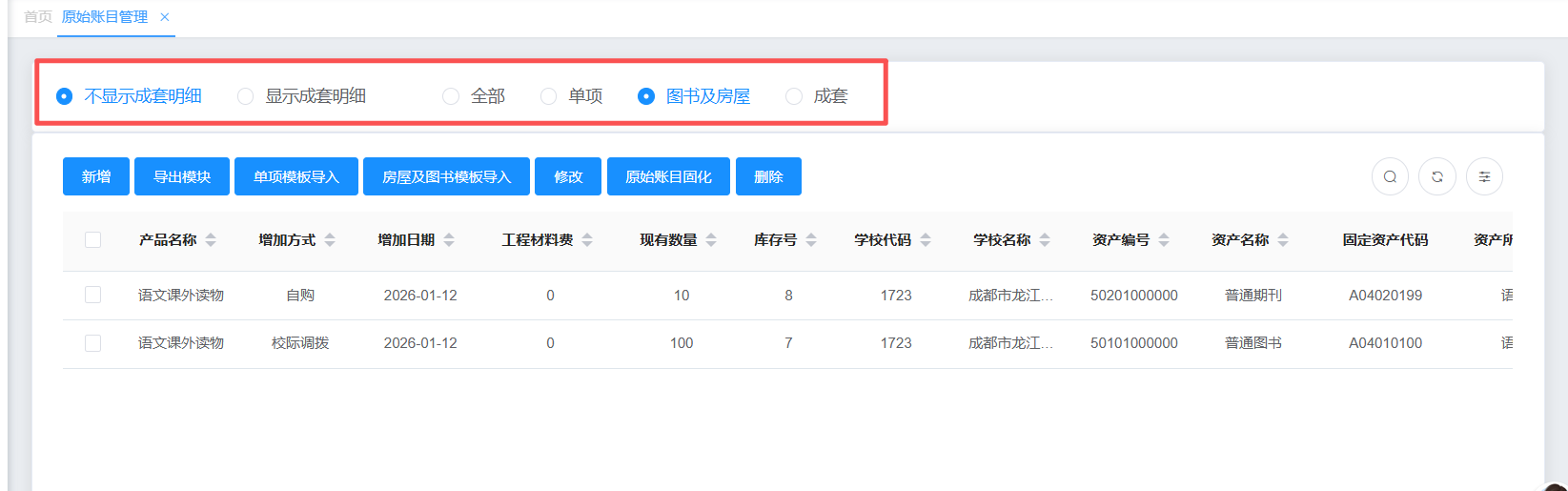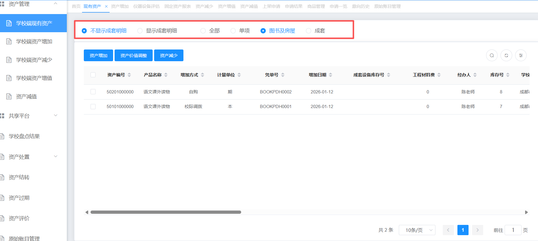 点击该页面顶部的单选框,列表可按勾选的选项显示数据。例如勾选"图书及房屋",则列表中仅展示"图书及房屋"类资产信息。