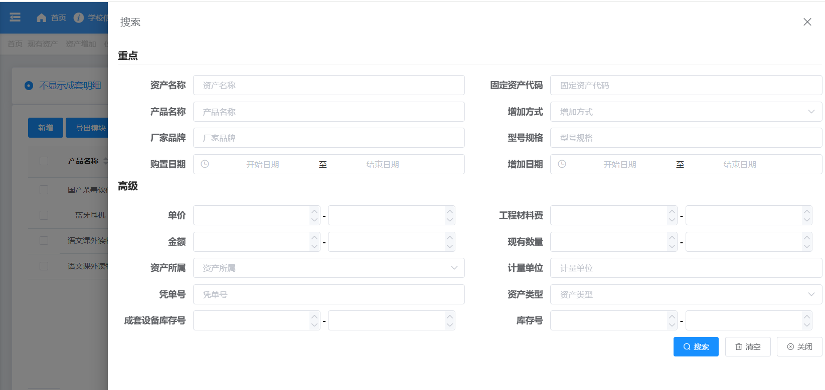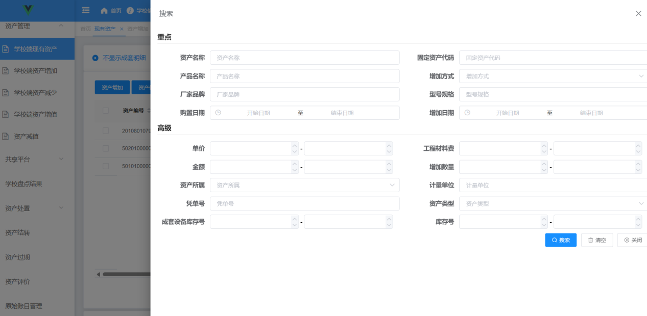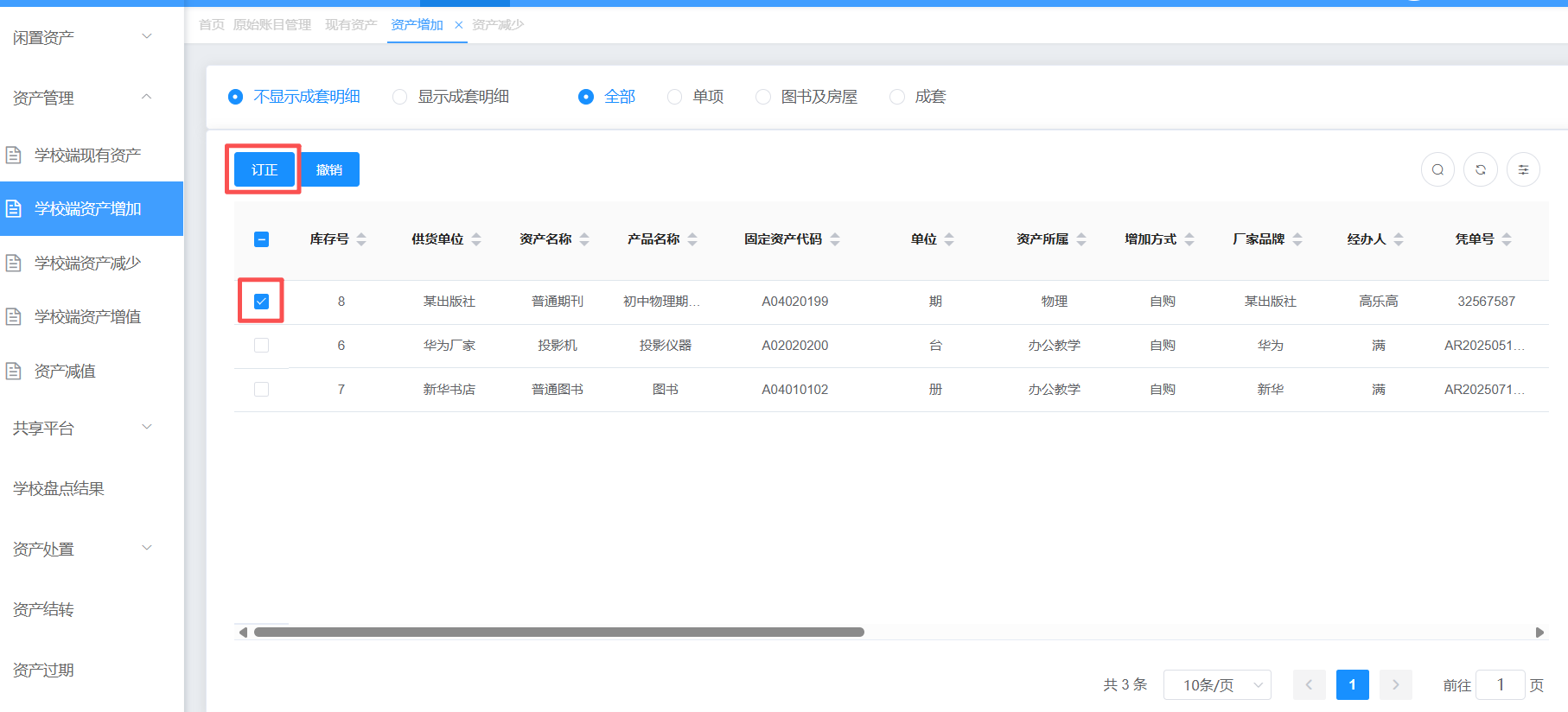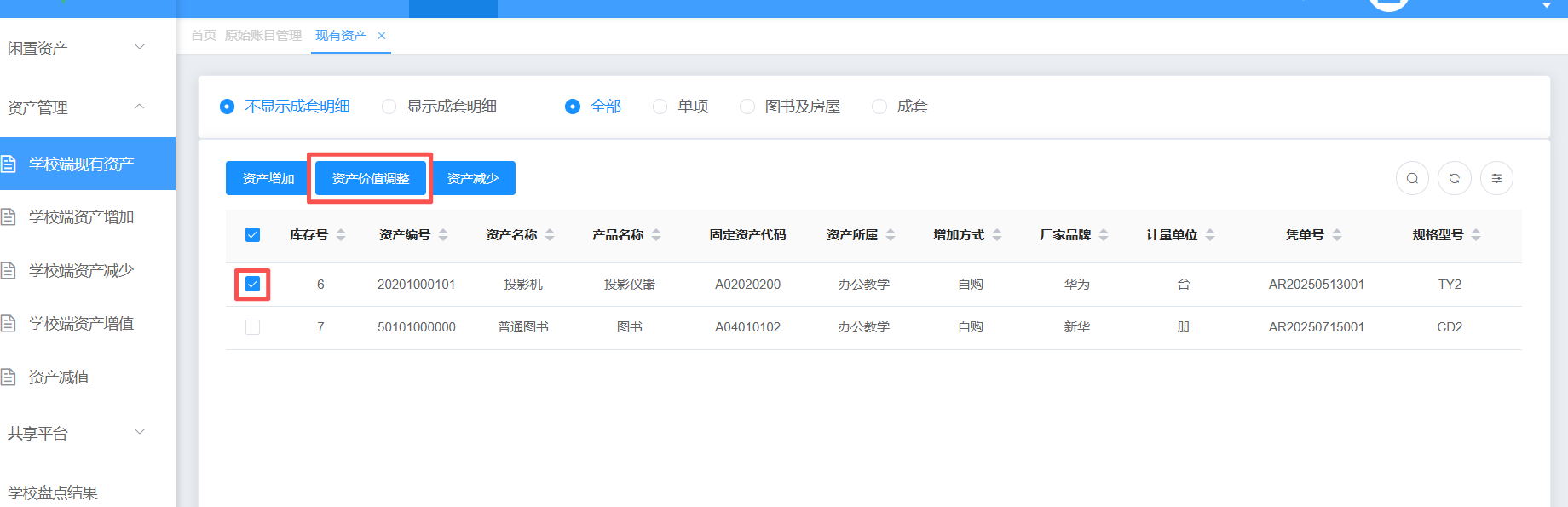 注意:根据本次资产调整后的价值是增加了还是减少了,该条资产信息会在对应的学校端资产增值或资产减值页面中显示。