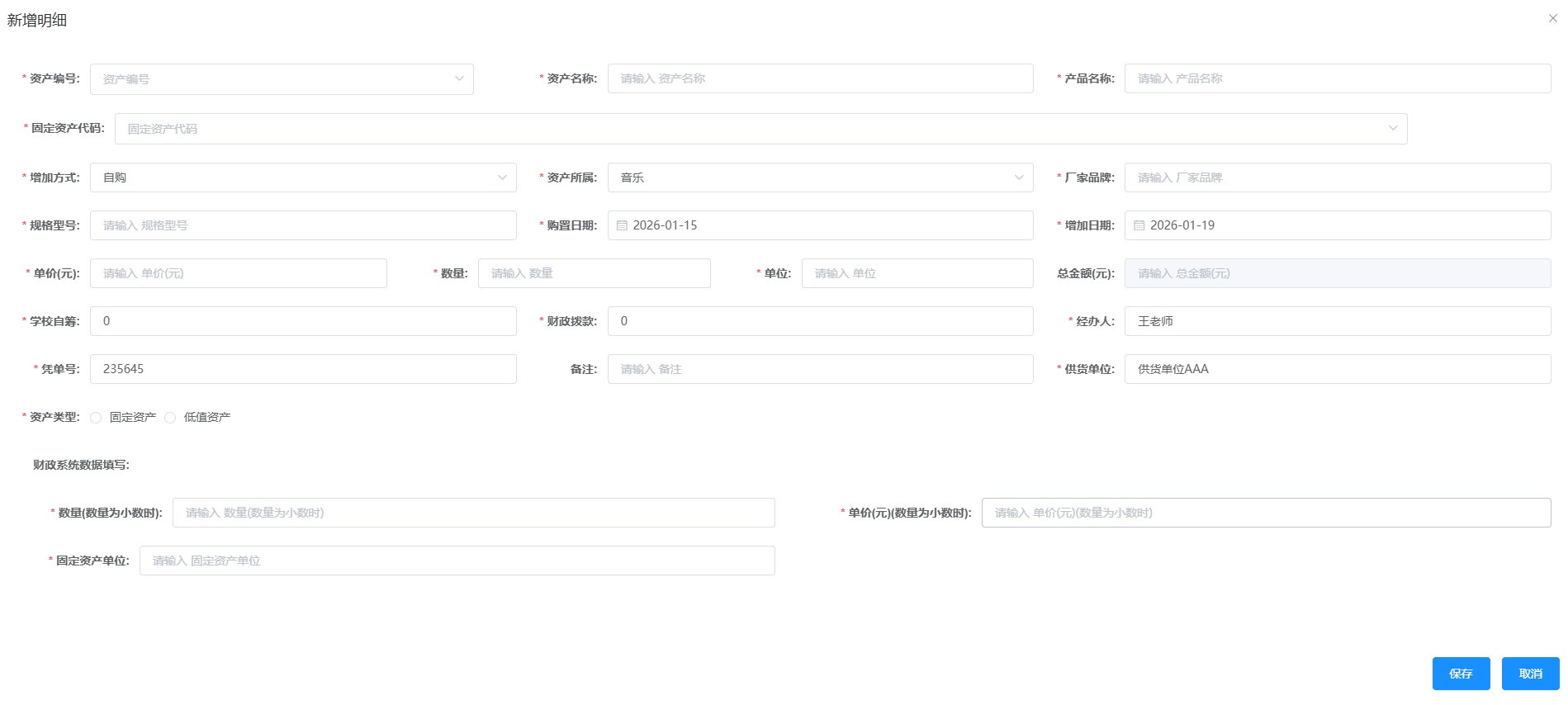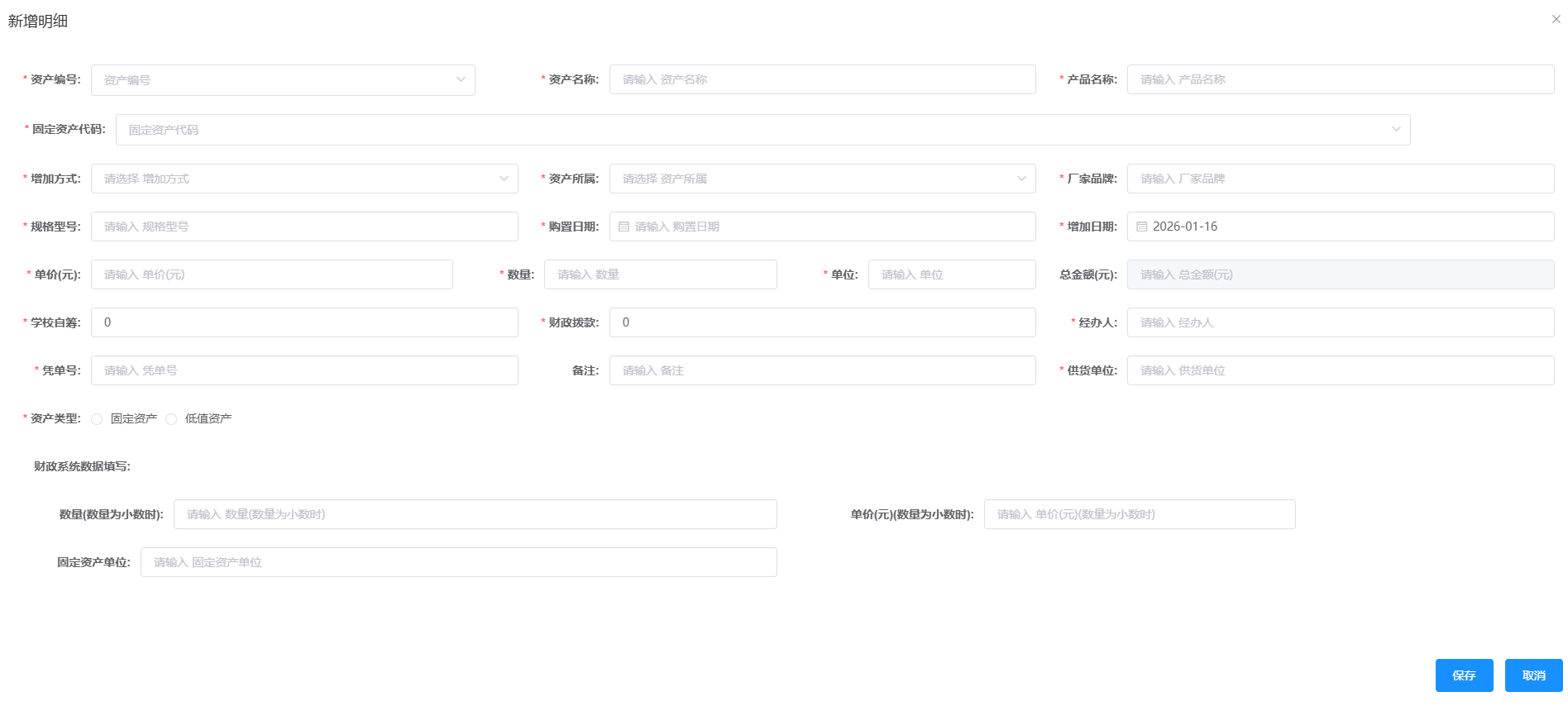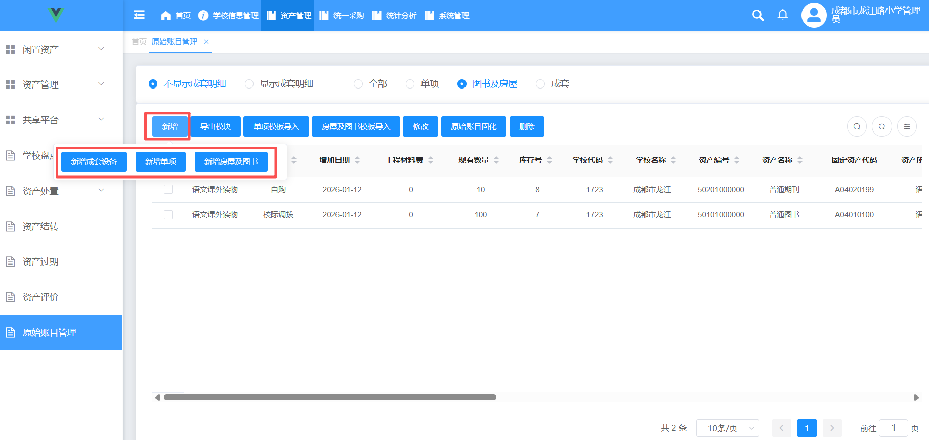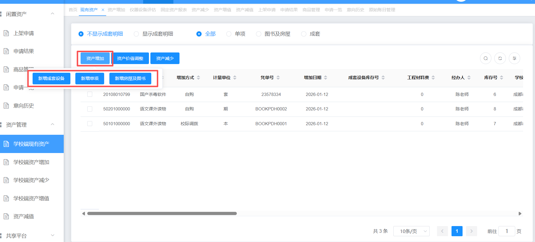 点击新增按钮,会展示三个选项分别为新增成套设备、新增单项、新增房屋及图书,可根据资产情况进行选择。