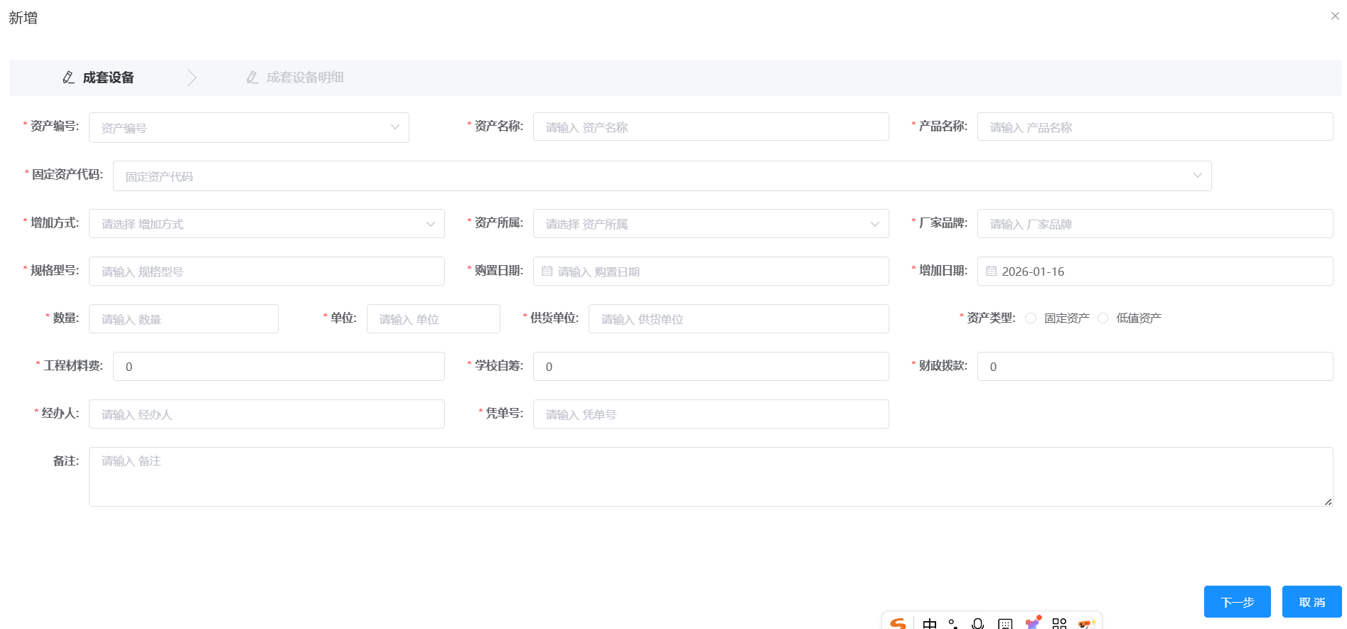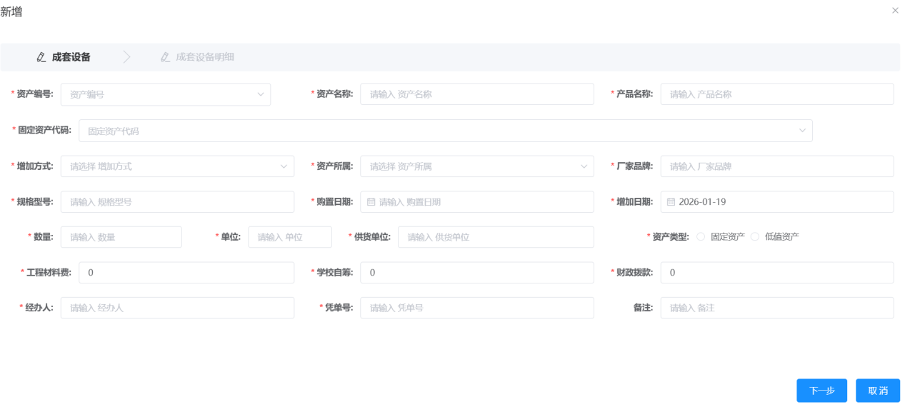 选择新增成套设备时,需要分两步,先添加成套设备主信息