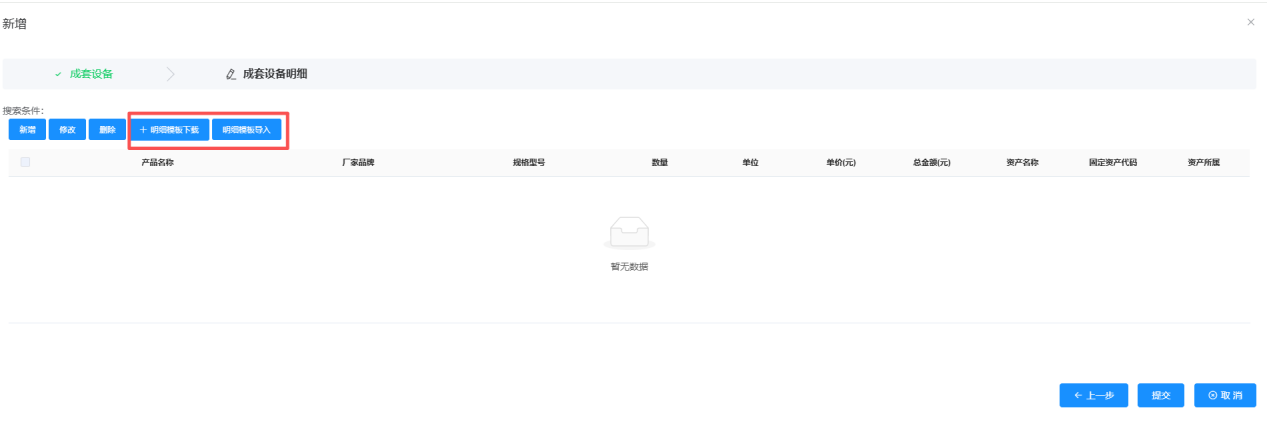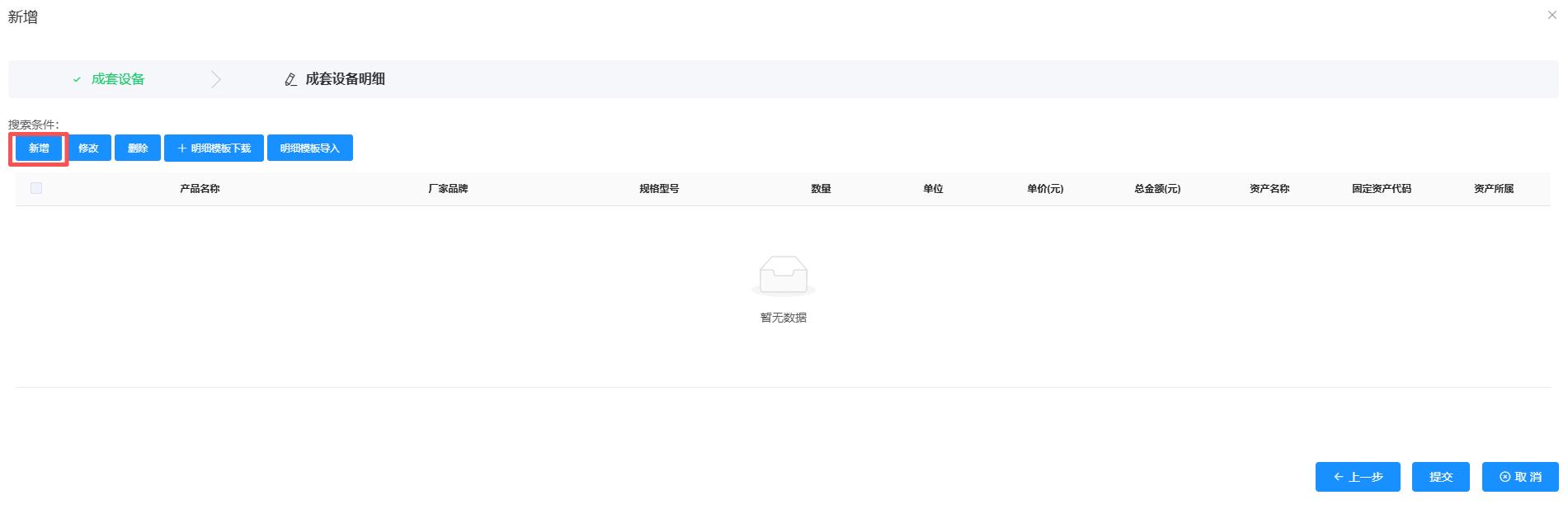 填写信息后点击下一步,进入到成套设备的明细列表页。点击新增按钮打开新增明细信息页。
