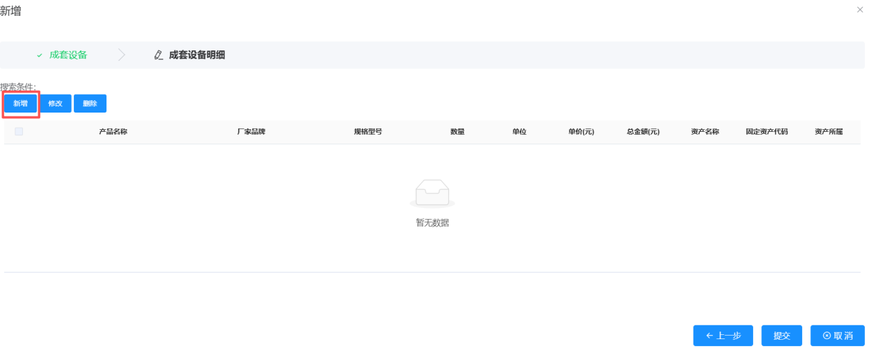 然后在下一步页面中点击新增按钮添加成套设备的明细信息
