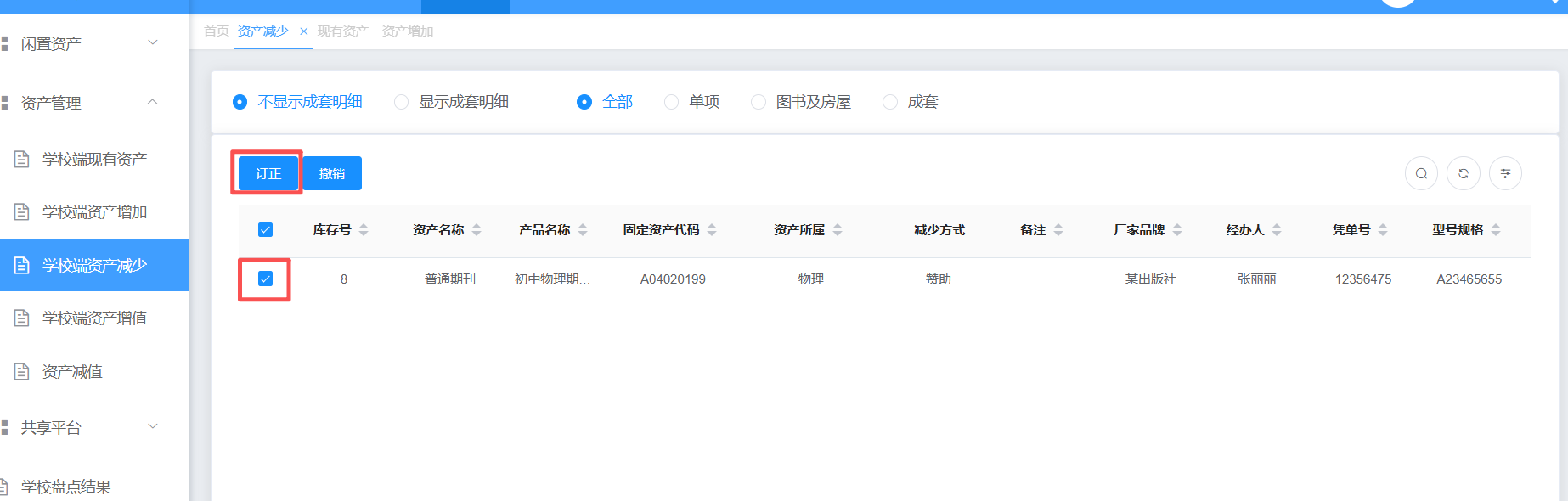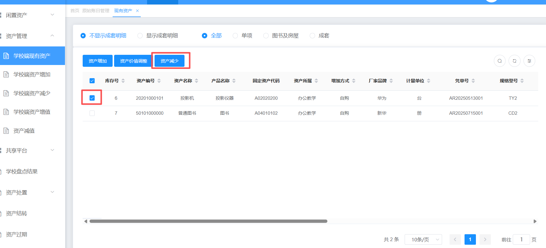 当学校对现有资产需要做减少时,需在此页面中操作按钮资产减少。勾选列表中资产信息后点击按钮资产减少。