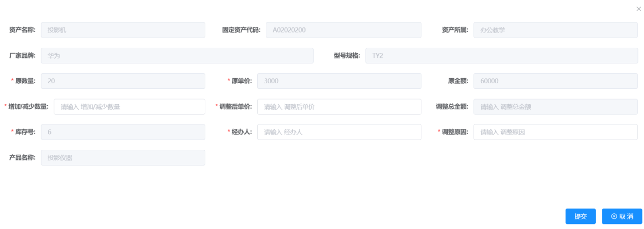 页面跳转至资产价值调整页面,对必填字段进行设置后点击提交按钮,即可完成资产价值调整。