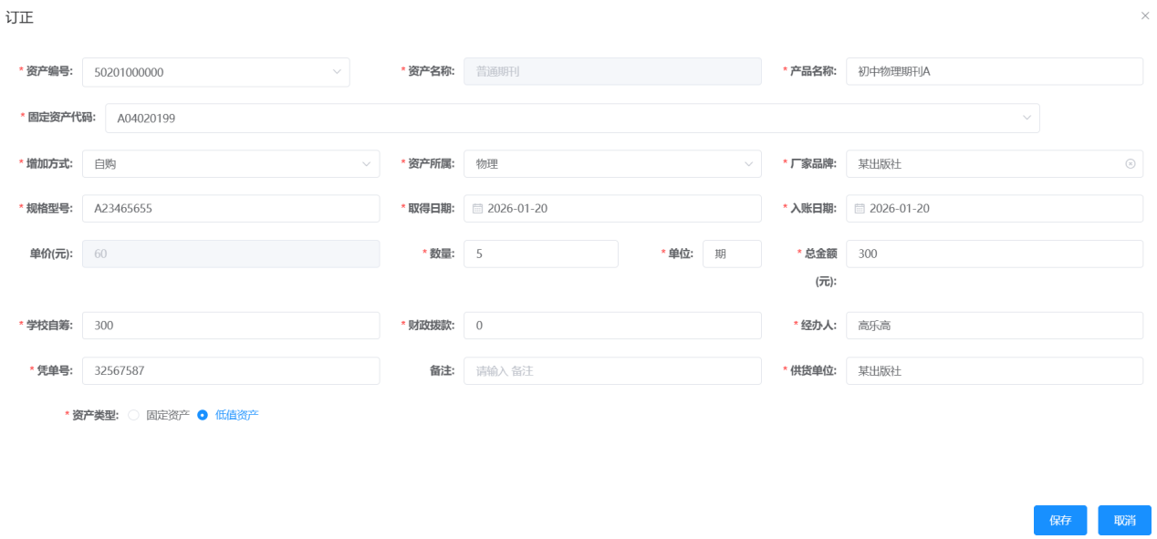 点击订正后打开订正页面,对该资产信息订正后点击保存即完成本次订正。