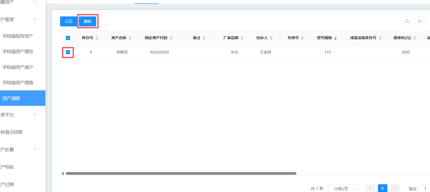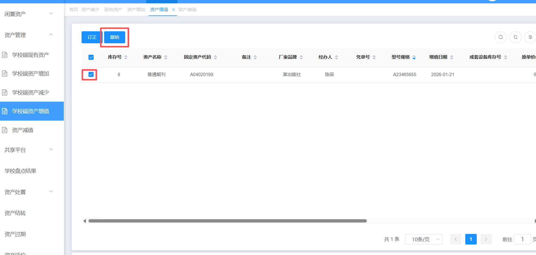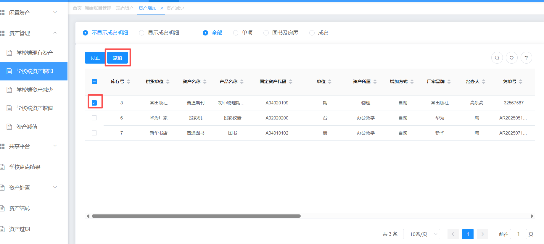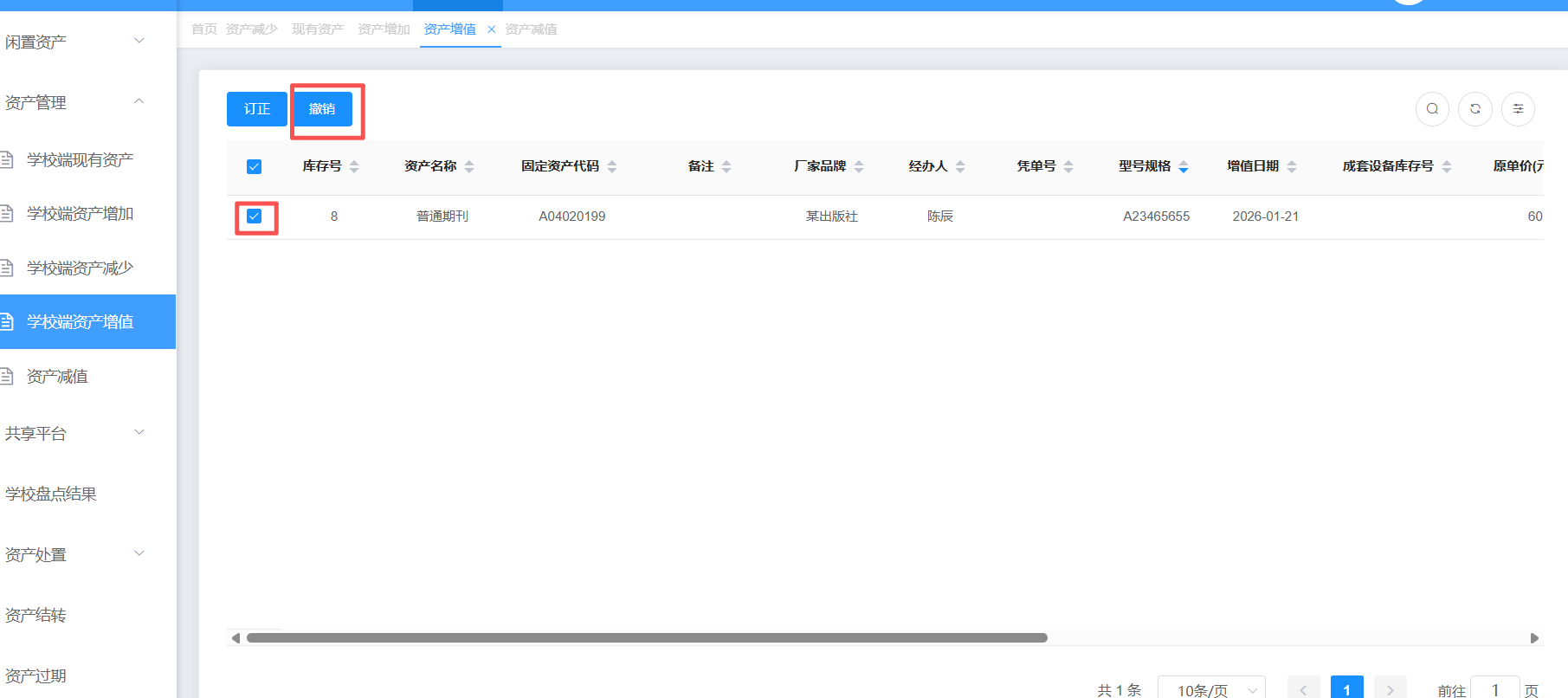 在本页列表中勾选任意数据后点击按钮撤销,可对增值的学校资产账进行撤销操作(撤销等同于删除)。