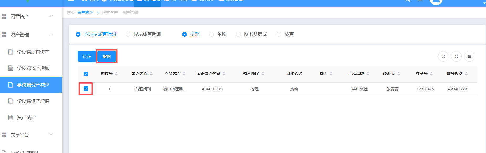在本页中点击按钮撤销,可对该条减少的学校资产账进行撤销操作,即不进行减少。