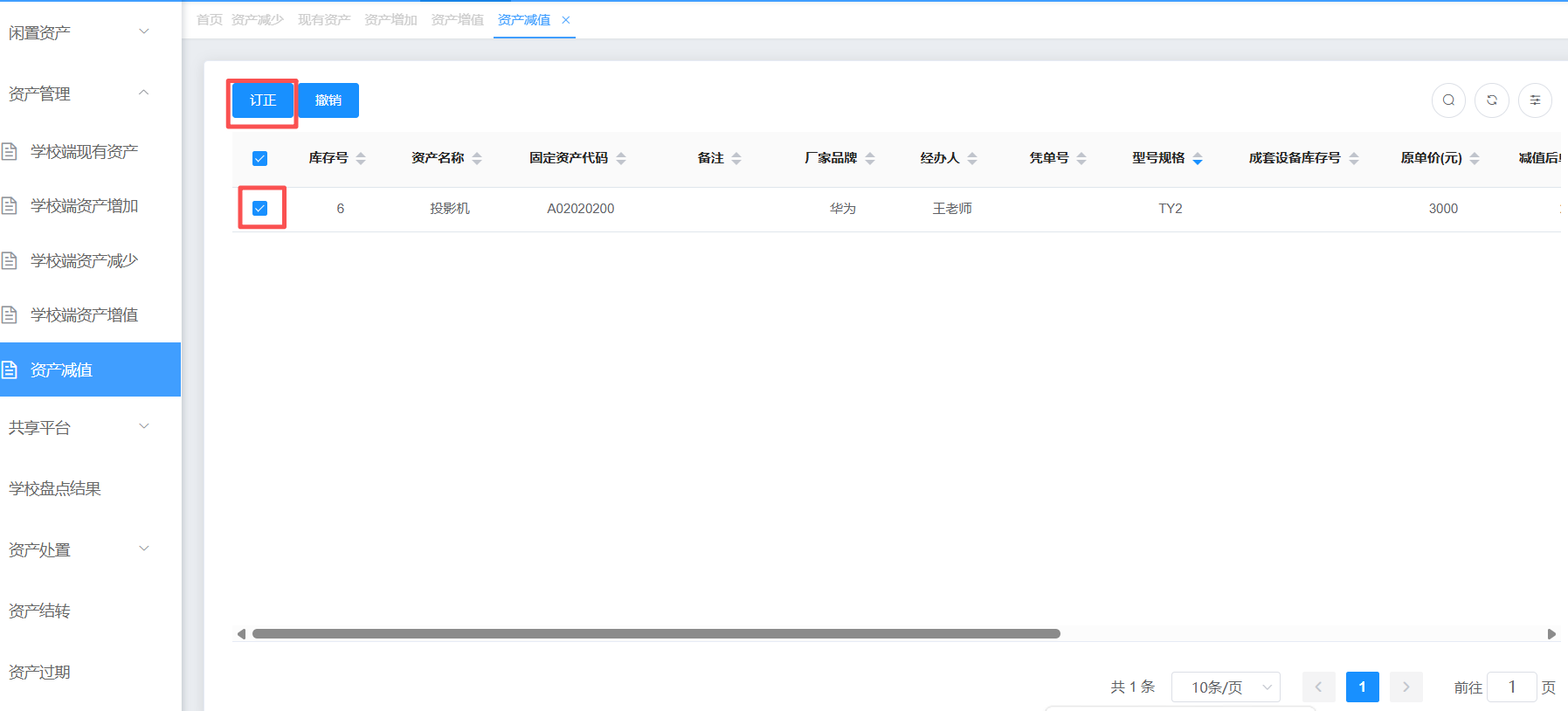 勾选列表中任意一条数据点击订正按钮,可对这条数据做减值操作的信息的订正。