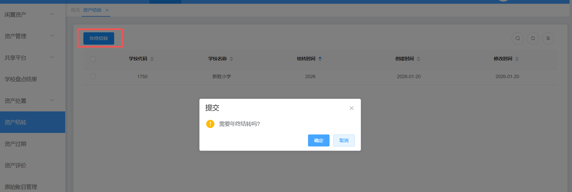 年终结转:在本系统中,年终结转意思是将本年度所有资产账目转为下一年期的初始账目,结转后不可对这些账目进行删除和修改操作。