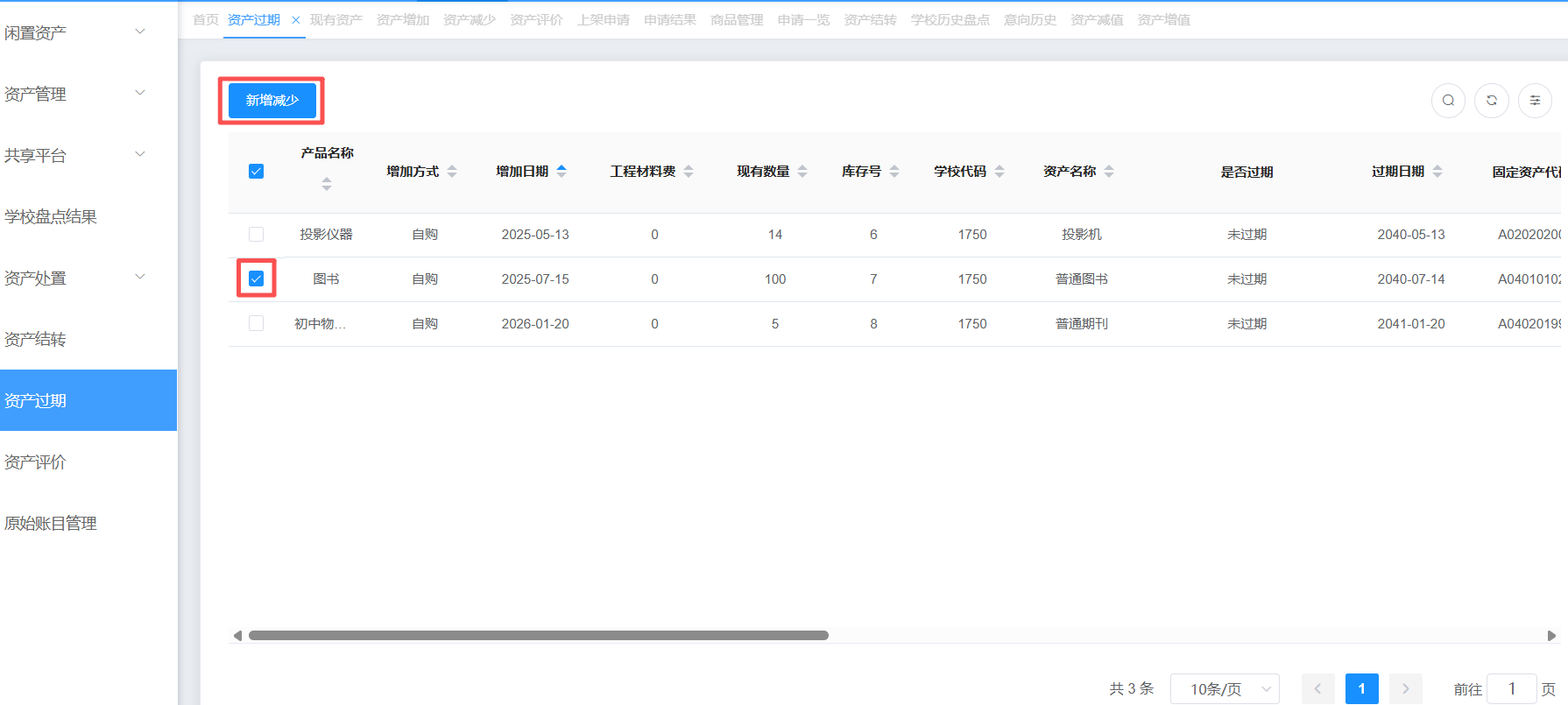 资产过期列表中展示所有现有资产基本信息及到期时间,同时可对资产做减少操作,在此页面对资产做减少操作后,该减少资产信息在资产减少页面展示。